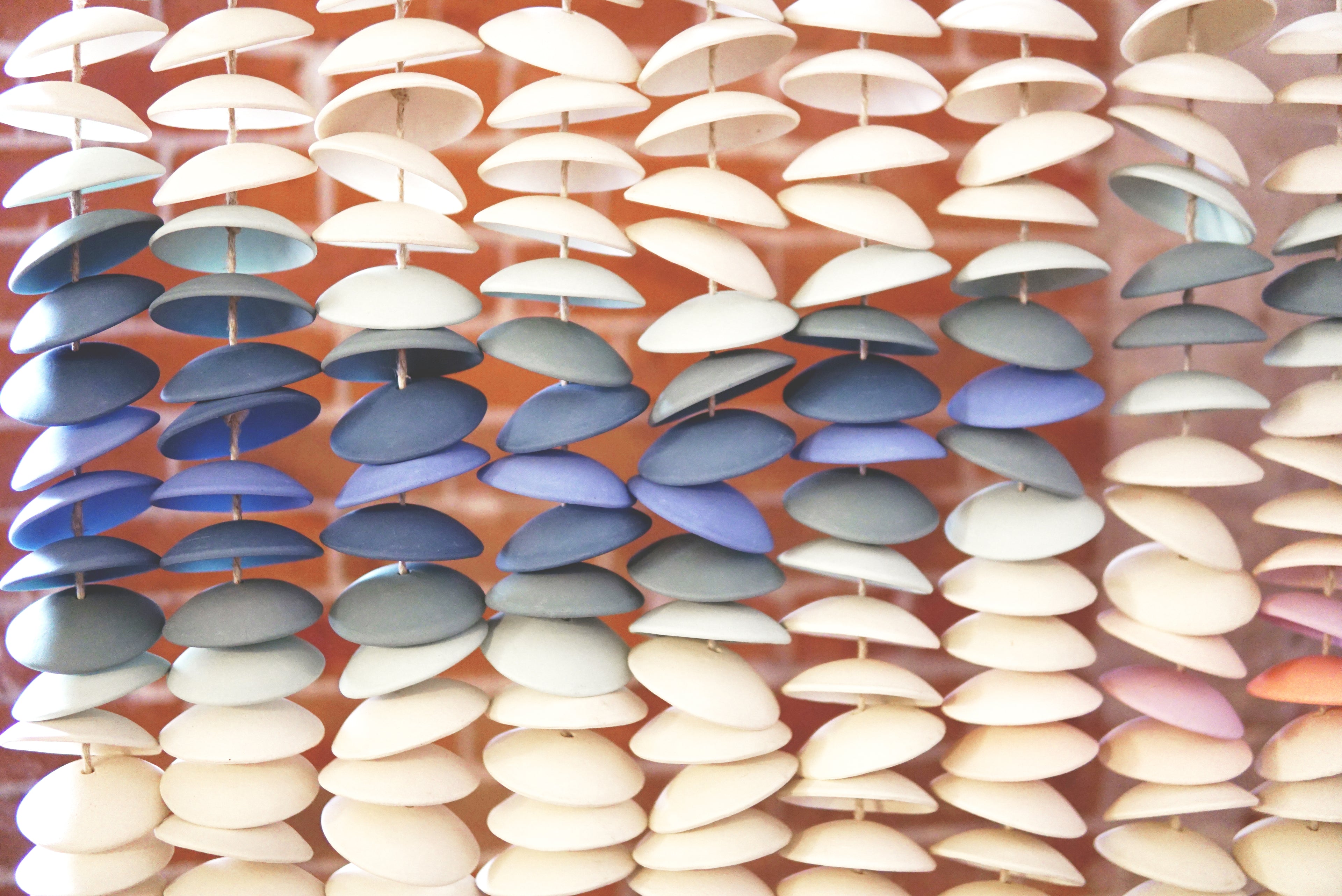 Ceramic chimes in light yellow, coral, teal, seafoam