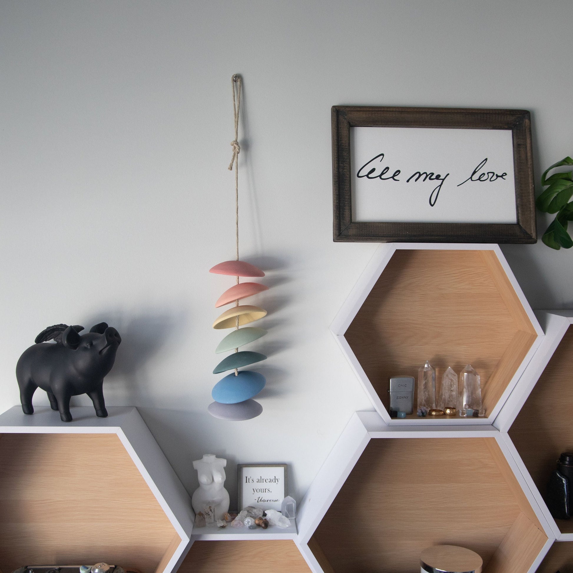 Chimes are made of stoneware clay and are tinted with specialized pigments before firing to 2232 degrees. Every batch is unique, making every chime unique!